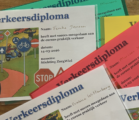 We hebben met de Bewonersraad afgesproken dat we de verkeerslessen op het woonhuis gaan doen. Als alle bewoners hun verkeersdiploma hebben, weten wij dat iedereen veilig over straat kan.